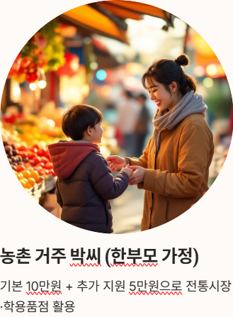 기본 10만 원 + 추가 지원 5만 원 → 전통시장·학용품점에서 활용